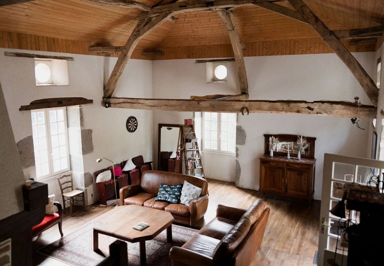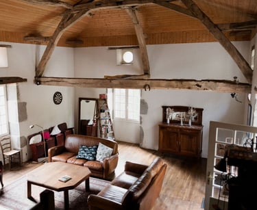 En grimpant quelques marches vous accèderez au salon avec son plafond cathédrale. De beaux volumes où l'on retrouve des meubles chinés qui apportent du charme et de l'authenticité. Un endroit idéal où l'on peut se recueillir auprès de la cheminé, passer du temps avec ceux qu'on aime et profiter de la vue sur le bief.