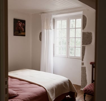 Seule chambre pour deux personnes de l'étage, elle donne coté rivière. Sa petite fenêtre carrée et son grand velux apporte une belle luminosité.